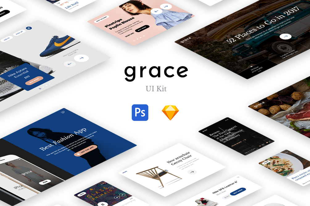 Grace is the modern and minimalistic UI Kit that will help you simplify your work. Includes 7 popular categories: Headers, Ecommerce, Blog/Magazine, Media, Forms, Navigation and Styleguide. All components are flexible and easy to use in Scetch & Photoshop. Create a beautiful and strong design for your new great project!